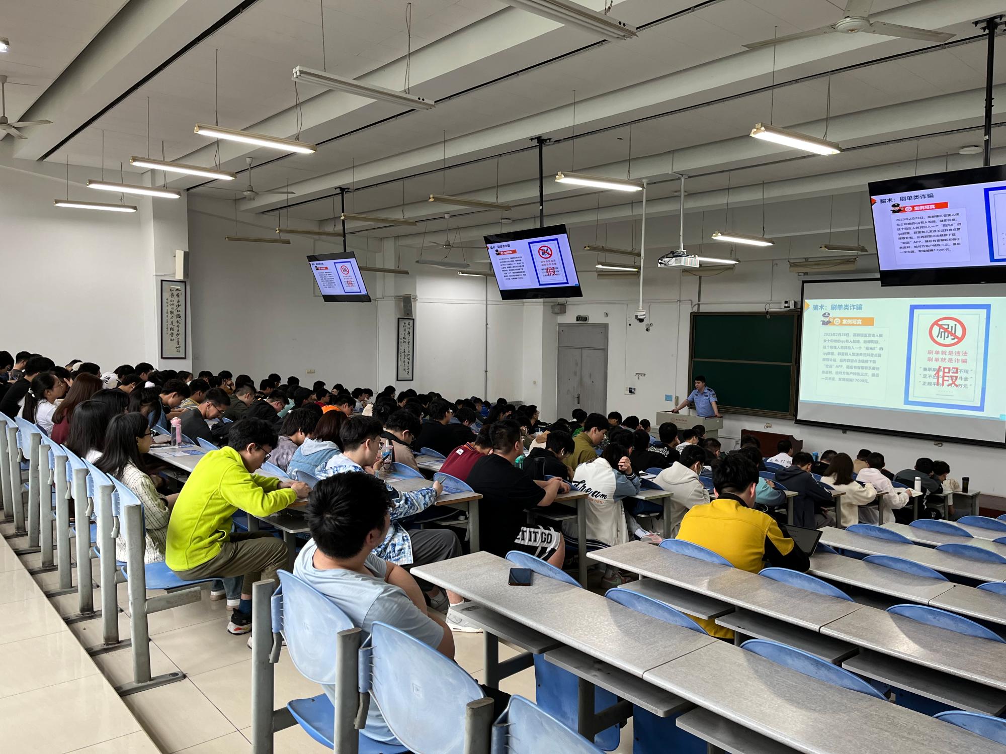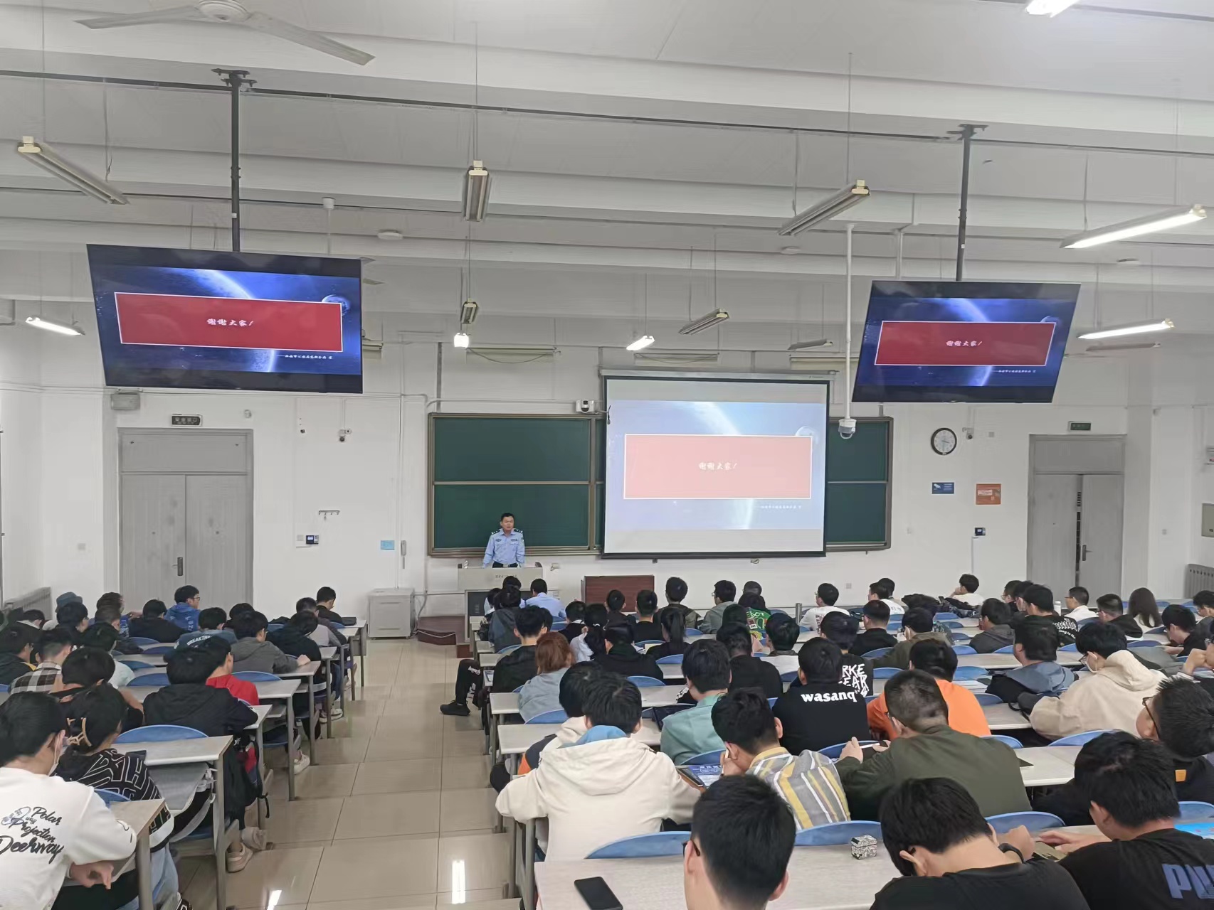 在B434教室开展反电信诈骗专题讲座,西安市公安局高新分局杨皓宇、潘志勇、黄航三位警官及学院200余名本科生参加本次活动,讲座由2021级本科生辅导员马力主持。