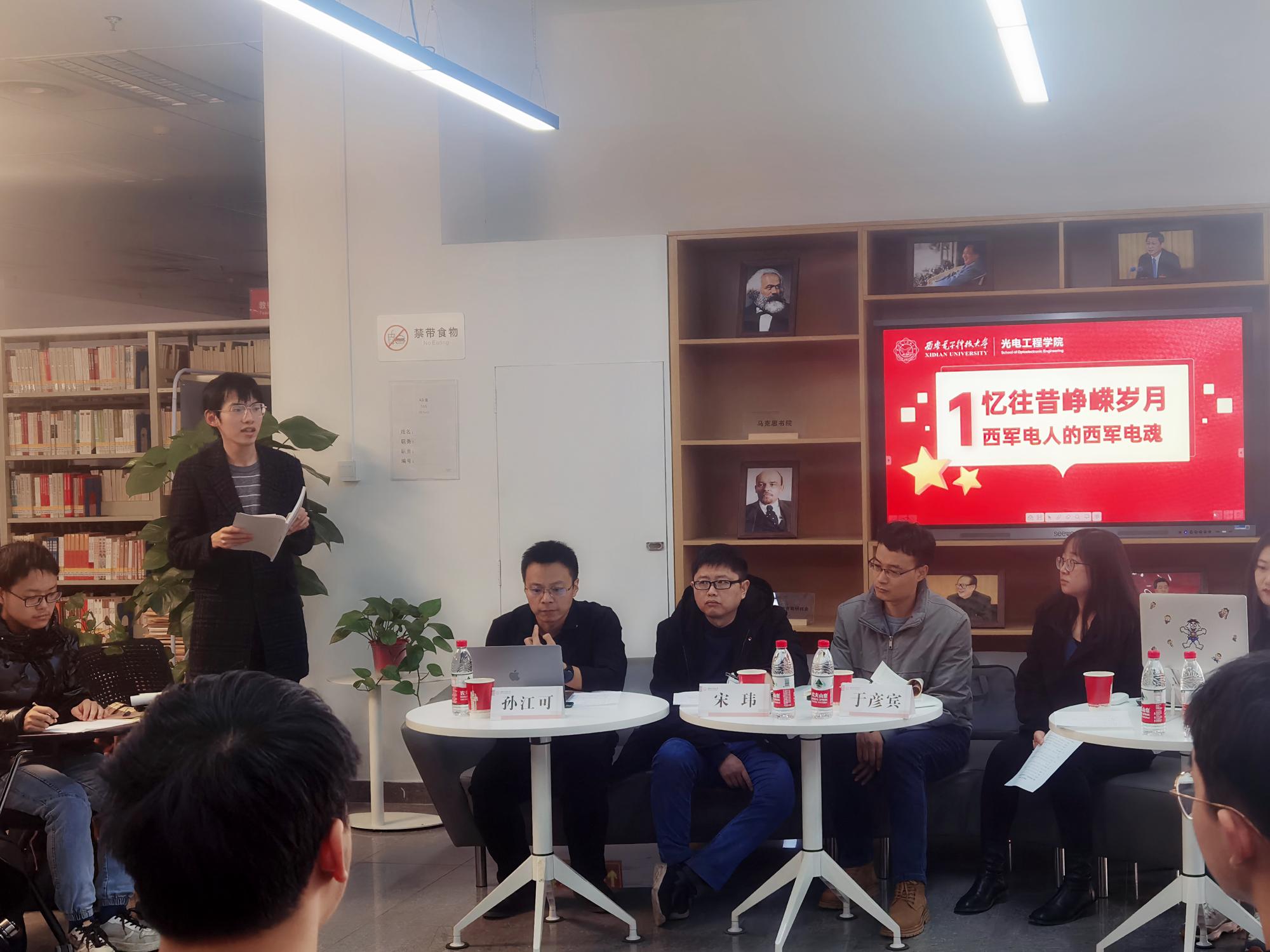 李洁介绍了本次专题研讨活动的目的和意义,她希望同学们通过学习研讨,深学细悟党的二十大精神,赓续西电红色基因,传承西电优良学风,走出属于西电人的青春梦想路。孙江可介绍了“沣镐思享”思政工作室建设初衷、理念和运行情况,他带领参会师生围绕“忆往昔峥嵘岁月,西军电人的西军电魂”,“什么是新时代?什么是新时代下的新征程?”、“如何做一名‘有理想、敢担当、能吃苦、肯奋斗’的新时代西电青年”等话题展开讨论交流。