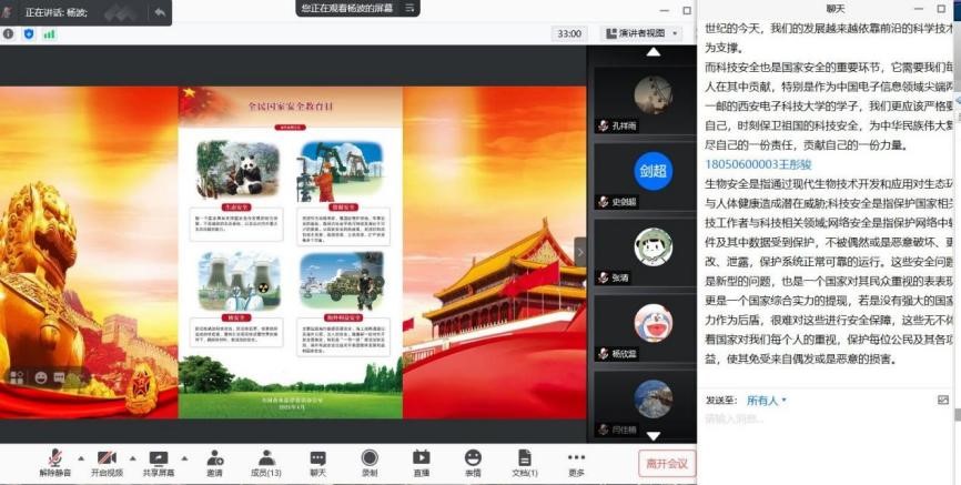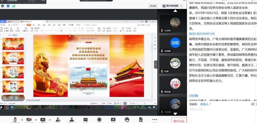 本科18级第五党支部开展“党员先锋论坛”活动,以“全民国家安全教育日”为契机进行法治宣传教育。本次会议依托线上会议平台进行,由支部委员杨波主持,支部全体学生党员参加了本次活动。
