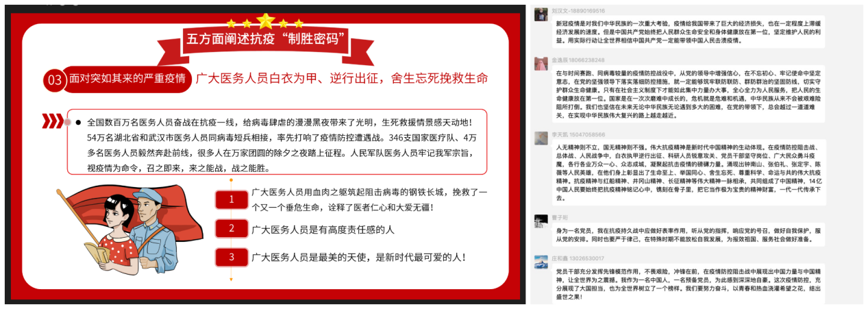 学生党员刘汉文谈道,新冠肺炎疫情是对我们中华民族的一次重大考验,疫情给我国带来了一定的经济损失,也一定程度上滞缓了经济发展的速度,但是中国共产党始终把人民群众生命安全和身体健康放在第一位,坚定维护人民的利益,用实际行动让全世界相信中国共产党一定能带领中国人民击溃疫情。
