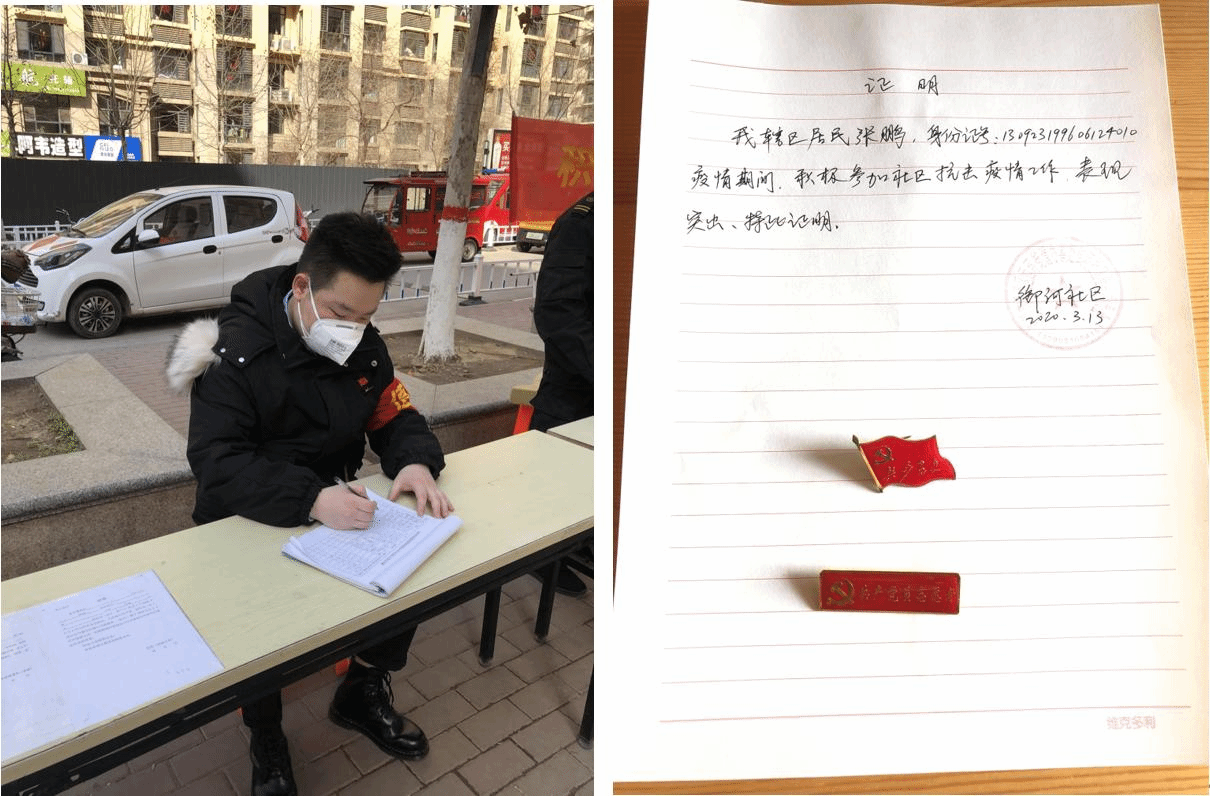 各级各支部党员积极支援地区、社区抗“疫”工作。2018级研究生党员褚安亮同学,主动请缨,参与到社区对外来人员、车辆的检查、劝返工作中,在平凡的岗位上发光发热,受到了社区管理部门的好评。2019级硕士第二党支部书记张鹏同学,在完成支部工作之余,在所在小区进行了为期一个月的志愿服务,张鹏表示,“越是经历困难的时刻,越是显示党员的本色,支援社区工作,守护家园平安,是党员应尽的职责”。2019级研究生党员储方寸同学在防疫志愿工作中,充分结合当地人员情况,向村集体提出了很多行之有效的防控建议。