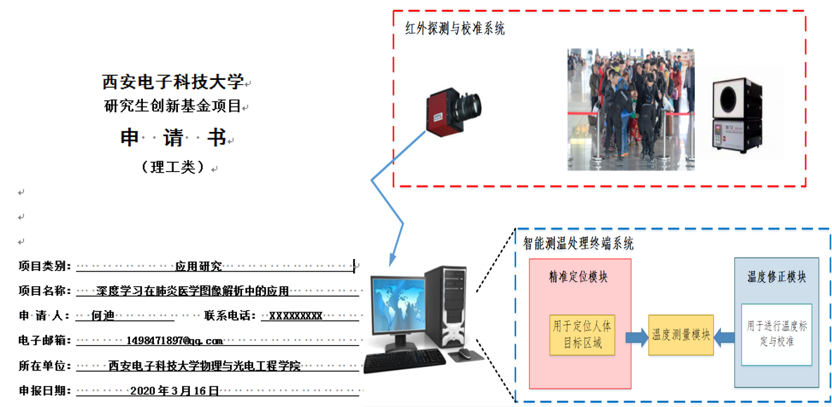 随着疫情防控暴露出的科学问题越发明晰,学院研究生结合学科方向,开展了大量的疫情防控科研创新。18级硕士何迪,基于深度学习人工智能技术在肺炎医学图像的解析方面进行了深入思考,以期对现有的CAD系统模型进行优化,于日前向学院提交了创新基金项目申请。18级博士张嘉嘉,在课题组火苗探测研究课题的基础上进行技术移植,对异常人员检测和跟踪技术进行了探索。