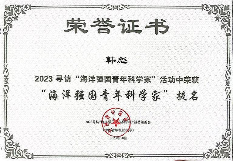 (通讯员 马力 吕强 路壹博)近日,由中国青年报社等单位共同开展的2023年度“海洋强国青年科学家”寻访活动落下帷幕,活动评选出“海洋强国青年科学家”10名、“海洋强国青年科学家”提名20名。韩漫基地 韩彪副教授荣获“海洋强国青年科学家”提名奖。韩彪老师长期从事海洋光学研究,曾经在科研院所工作多年,并乘坐“深海勇士号载人潜水器”亲自下潜2次海底,完成了我国首次深海无线光通信实验,海下...