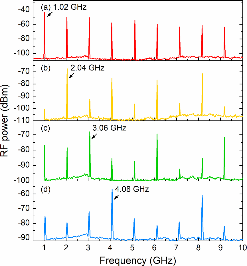 超快激光技术与应用研究中心采用自行研制的10 W级GHz重复频率克尔透镜锁模Yb:CYA激光振荡器作为泵浦源,实现了瓦量级多GHz重复频率的飞秒OPO运转。OPO输出信号光的波长调谐范围为1.41–1.64 μm,最大平均功率1.58 W,最短脉冲宽度139 fs,重复频率1 GHz;中红外闲频光的波长调谐范围为2.8–4.0 μm,最大平均功率1 W,最短脉冲宽度103 fs,重复频率1 GHz。通过调整腔长,分别获得了2 GHz、3 GHz和4 GHz重复频率的信号光输出,各重复频率下输出功率均超过1 W。据我们所知,该成果实现了目前GHz重复频率飞秒OPO的最高功率输出。相关成果发表在Opt. Lett. 50, 2453-2456 (2025)。论文第一作者为团队青年教师同晖,合作单位包括陕西理工大学、上海交通大学、中山大学和中国科学院物理研究所。